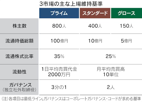 一連の再編で上場と廃止の基準を厳しくした。これまでのルールでは東証1部に時価総額40億円で上場でき、10億円を下回らないと上場廃止にならなかった。プライムでは上場も廃止も一律に流通時価総額100億円(時価総額に換算すると約250億円になる企業が多い)以上を求めた。時価総額が数百億円の中堅企業は上場廃止のリスクと隣り合わせになる。