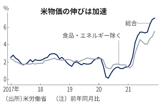 【ワシントン=鳳山太成】米労働省が12日発表した2021年12月の消費者物価指数(CPI)は前年同月比の上昇率が7.0%と39年半ぶりに7%台に達した。厚待遇の仕事を待つ労働者が多く、人手が集まらずに賃金上昇圧力が強まる。新型コロナウイルスのオミクロン型の感染拡大で供給制約に拍車がかかる可能性がある。