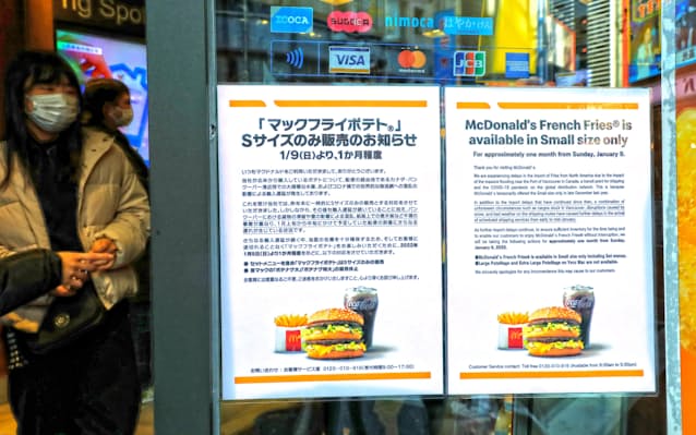 日本マクドナルドは加工済みのポテトを北米から船便で輸入している。寄港地であるカナダ・バンクーバー港近郊での水害や大雪、世界的なコンテナ不足に加えて海上の悪天候も重なり輸入が遅れていた。1月9日からポテトの販売をSサイズに限定していた。ハンバーガーとのセットメニューのポテトもSサイズのみとし、通常のセット価格の50円引きで販売していた。