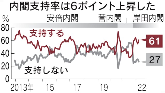 日本経済新聞社とテレビ東京は25~27日に世論調査を実施した。岸田文雄内閣の支持率は61%で2月の前回調査から6ポイント上昇した。ロシアのウクライナ侵攻を巡る日本政府の取り組みについては67%が「評価する」と答えた。「評価しない」は22%だった。