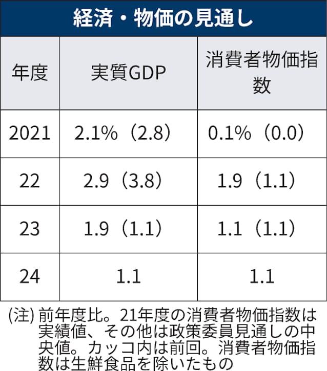 日銀は28日の金融政策決定会合で大規模緩和の維持を決めた。10年物国債を0.25%の利回りで無制限に買い入れる指し値オペ(公開市場操作)を毎営業日実施することも決定。2022年度の物価上昇率見通しは従来の1.1%から1.9%に引き上げたが、日銀は物価上昇は一時的として現行の金融政策を堅持する。