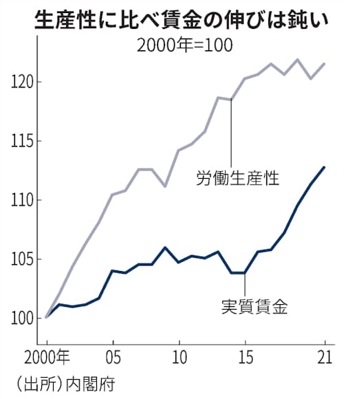 実質賃金の伸びは2000年以降、労働生産性の伸びを下回る。資源高による海外への所得流出も影響している。投資によって生産性をより高めつつ、生産性に見合った賃金上昇も進めるには、省エネルギーの取り組みなど経済構造の転換も求められる。