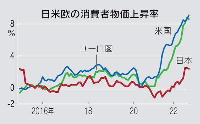 総体としては「デフレ脱却に向けて十分とはいえない」と評価した。物価上昇率は6月に9.1%の米国、8.6%のユーロ圏に比べるとなお低水準にある。国内では中小企業の価格転嫁が遅れて「輸入インフレにとどまっている」と分析した。