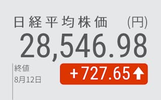 12日の東京株式市場で日経平均株価は反発し、前営業日にあたる10日比727円高の2万8546円で取引を終えた。1月12日以来7カ月ぶりの高値をつけた。米国の景気懸念が後退し、リスク選好の動きが進んだ。電気機器や機械といった景気敏感株や通信、金融など幅広い銘柄に買いが入った。
