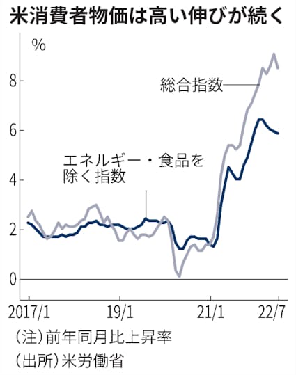 【ワシントン=高見浩輔】米労働省が10日発表した7月の消費者物価指数(CPI)は前年同月比8.5%上昇した。ガソリン価格が前月から下がり、伸び率は約40年半ぶりの大きさだった6月の9.1%から縮小した。米経済は4~6月まで2四半期続けてマイナス成長となったが、賃金の上昇などを背景に値上がりは広がっている。インフレ圧力は根強く残る可能性がある。