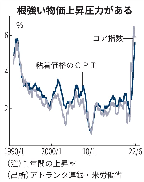 家賃や外食の価格が代表例で、こうしたモノやサービスの価格上昇は一度速まると下がりにくく、根深いインフレ圧力になる。アトランタ連銀がそうした「粘着価格」を集めてつくった消費者物価指数は6月、1年間の上昇率が5.6%に達した。1991年2月以来、約31年ぶりの水準で、まだ加速が止まらない。