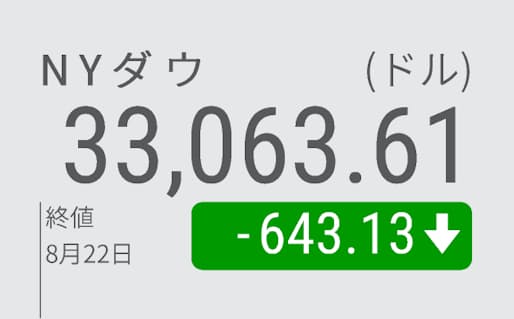 【NQNニューヨーク=古江敦子】22日の米株式市場でダウ工業株30種平均は続落し、前週末比643ドル13セント(1.9%)安の3万3063ドル61セントで終えた。米連邦準備理事会(FRB)が金融引き締めに積極的な姿勢を維持するとの観測が改めて強まり、幅広い銘柄に売りが出た。米株式相場は7月中旬から上昇基調が続いたため、目先の利益を確定する売りも出やすかった。