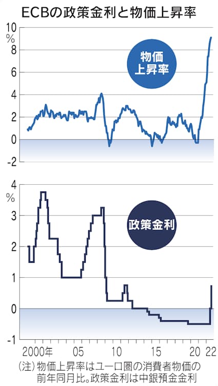 【フランクフルト=南毅郎】欧州中央銀行(ECB)は8日の理事会で、政策金利を0.75%引き上げると決めた。0.75%の上げ幅はユーロが誕生した1999年以降で初めて。欧州ではウクライナ危機に伴う資源高で、インフレ率が年内に10%程度まで高まる可能性も出てきた。ECBは通常(0.25%)の3倍となる大幅利上げにより、景気後退リスクを覚悟のうえで高インフレを抑制する。