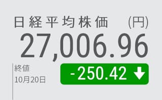 20日の東京株式市場で日経平均株価は3日ぶりに反落し、前日に比べ250円42銭(0.92%)安の2万7006円96銭で終えた。米長期金利が2008年7月以来となる4.1%台まで上昇した。米金利上昇を嫌気し、19日の米株式相場が下げたのを受け、短期筋による株価指数先物への売りが膨らんだ。午後に入ると、中国の新型コロナウイルス感染対策の規制緩和の観測から、下げ幅を縮小した。