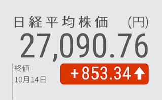 14日の東京株式市場で日経平均株価は5営業日ぶりに反発した。大引けは前日比853円34銭(3・25%)高の2万7090円76銭だった。上げ幅は3月17日(890円88銭)以来7カ月ぶりの大きさ。7日以来、1週間ぶりに終値で2万7000円台を回復した。前日の米株式相場が急伸した流れを受けて短期筋の買い戻しなどが膨らみ、朝方から全面高の展開となった。アジア株の大幅な上昇も投資家心理を一段と上向かせ、上げ幅は900円を超える場面があった。