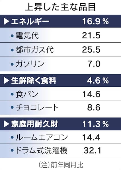 エネルギー関連の上昇率は16.9%で、8月と同水準だった。電気代が21.5%、都市ガス代が25.5%と引っ張っている。灯油は8月の18.0%を上回る18.4%の上昇率だった。ガソリンも7.0%で、8月の6.9%をわずかに上回った。
