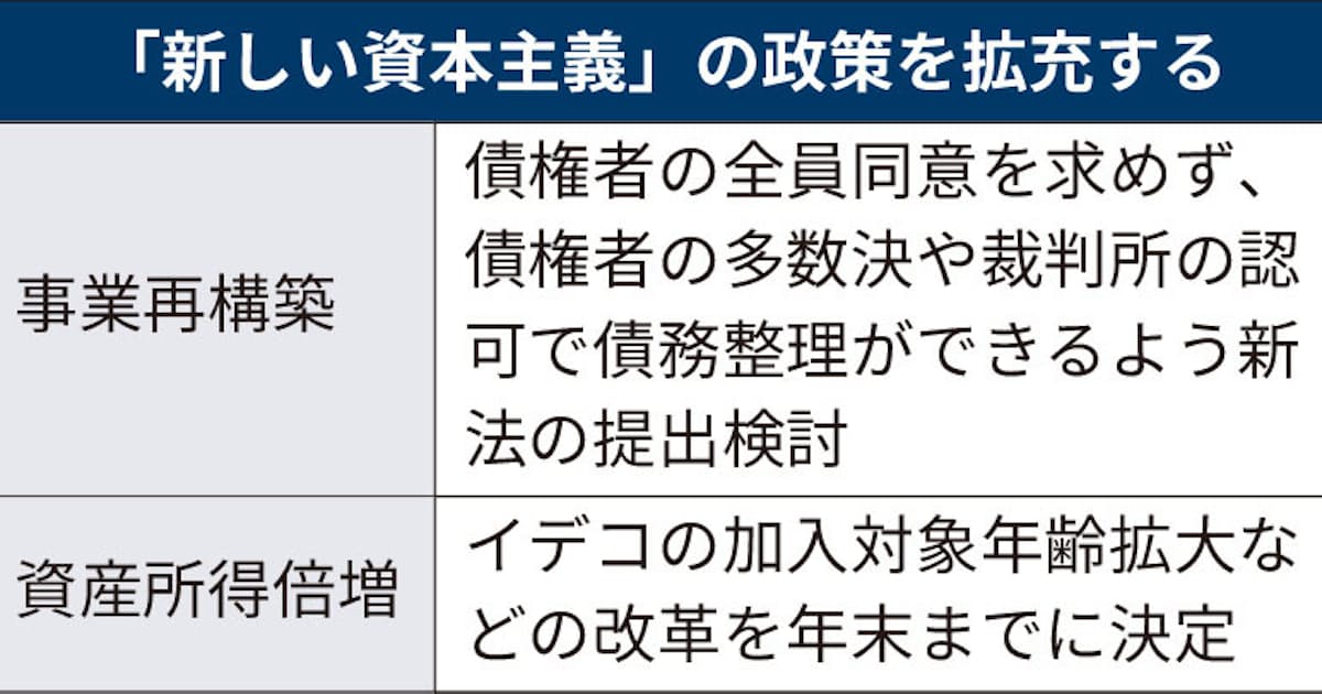 政府は10月末にまとめる総合経済対策で、岸田文雄首相が掲げる「新しい資本主義」の追加策を打ち出す。経営不振に陥った企業が債務を圧縮する私的整理を全債権者の同意がない場合でも進められるようにし、早期の再建を促す。新型コロナウイルス禍からの経済の再生を加速する。2023年の通常国会への新法案の提出をめざす。