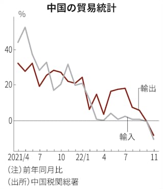 輸入は主要品目である集積回路が28%落ち込み、7カ月連続で減った。化粧品も前年同月を2割下回った。中国では新型コロナの封じ込めを狙う「ゼロコロナ」政策で移動制限が厳しく、内需が弱まっている。原油は3割増えた。