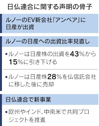 両社は「本協議が重要なマイルストーンを迎えた」との声明を30日に出した。資本関係はルノーの日産への出資比率を43%から15%へ引き下げる。ルノーが設立を予定するEV新会社「アンペア(仮称)」に対して日産が出資することも声明に盛り込んだ。詳細は詰めているが、現時点では最大15%程度を出資する見通しだ。