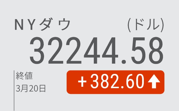 【NQNニューヨーク=川上純平】20日の米株式市場でダウ工業株30種平均は反発し、前週末比382ドル60セント(1.2%)高の3万2244ドル58セントで終えた。欧州金融機関の経営不安から金融システムが不安定化するとの懸念が和らいだ。先週末にかけて大きく売られていた景気敏感株が買い直され、相場を押し上げた。