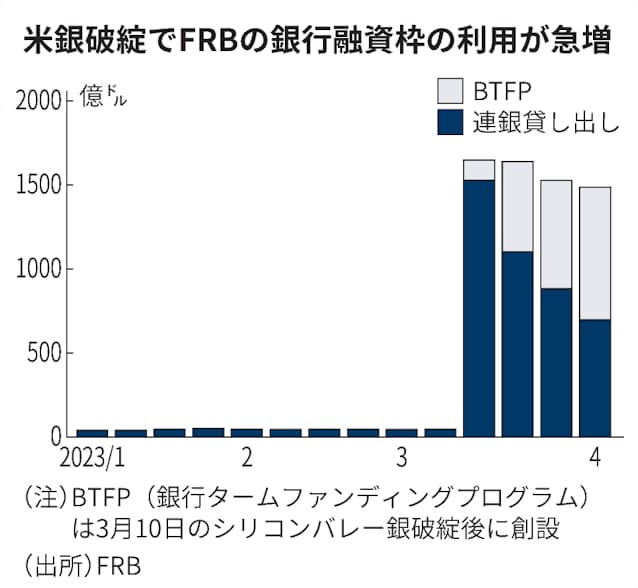 SVBの破綻後、他の銀行にも信用不安が飛び火し、FRBの統計によると米中小銀は3月半ばの1週間で過去最大の預金流出を記録した。金融機関が資金をやり取りする短期金融市場では資金調達コストが上がり、資金繰りが苦しくなった銀行はFRBなど公的機関からの融資に頼った。FRBが設けている「連銀貸し出し」と新設した「銀行タームファンディングプログラム(BTFP)」という2つの融資枠は足元の利用額が計1500億ドル規模で高止まりする。