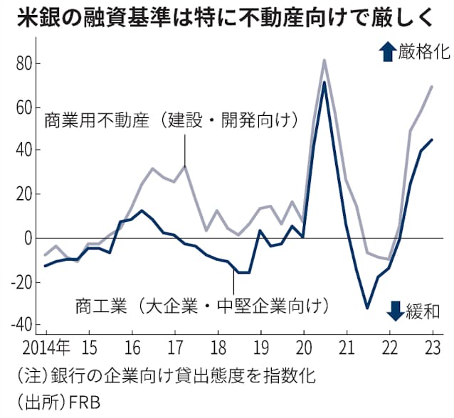 世界でオフィスなどの商業用不動産(CRE)の取引縮小や、こうした物件に投資する不動産投資信託(REIT)の価格下落が起きているとも指摘した。金利上昇に加え、CRE市場における主な貸し手だった米中堅・中小銀や投資ファンドなどのノンバンクが財務悪化で慎重姿勢を強めているのが逆風となっている。