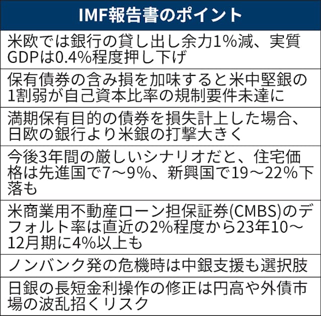 【ニューヨーク=斉藤雄太】国際通貨基金(IMF)は11日、米地銀の破綻で広がった金融不安が銀行経営や経済活動に与える影響を分析した報告書を公表した。米中堅銀行が金利の急上昇で膨らんだ保有債券の含み損を実際に損失処理する事態になれば、1割弱にあたる銀行で資本不足に陥るとの試算を示した。投融資の縮小で住宅や商業向け不動産市場への打撃が大きくなるリスクも指摘した。