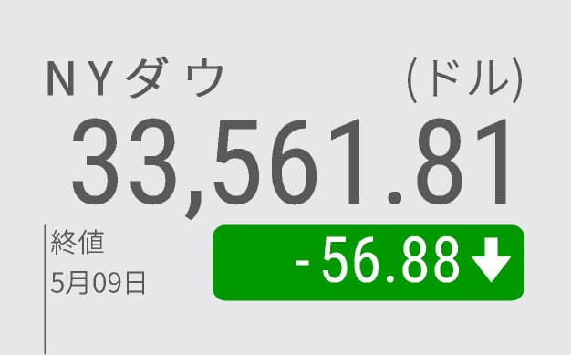 【NQNニューヨーク=横内理恵】9日の米株式市場でダウ工業株30種平均は続落し、前日比56ドル88セント(0.2%)安の3万3561ドル81セントで終えた。10日に4月の米消費者物価指数(CPI)の発表を控え、投資家の様子見姿勢が強かった。米地域銀行株の不安定な値動きに加え、米政府の債務上限問題などへの警戒は相場の重荷だった。