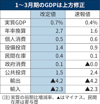 GDPの半分以上を占める個人消費は速報段階の前期比0.6%増から0.5%増に下方修正した。3月分の消費関連統計を織り込んだ結果、外食などのサービス消費の伸びが縮小した。公共投資は2.4%増から1.5%増に引き下げた。