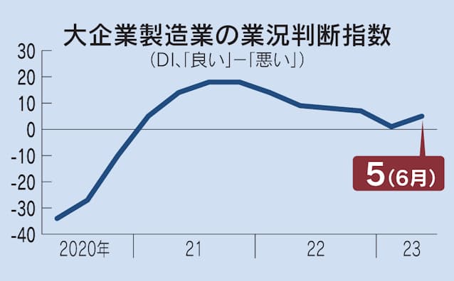 日銀が3日発表した6月の全国企業短期経済観測調査(短観)で、大企業製造業の景況感を示す業況判断指数(DI)は、前回の3月調査から4ポイント改善してプラス5だった。7四半期ぶりに改善に転じた。供給制約の影響が和らいだ。大企業非製造業は新型コロナウイルス禍から経済回復が進みプラス23と前回から3ポイント改善した。