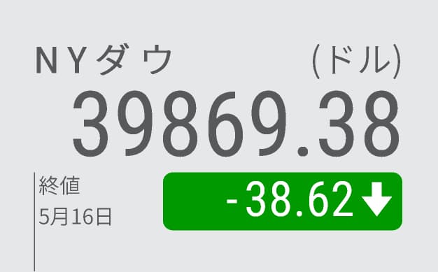 【ニューヨーク=斉藤雄太】16日の米株式市場でダウ工業株30種平均が一時、取引時間中としては初めて4万ドルの大台を付けた。インフレの鈍化で米連邦準備理事会(FRB)が年内に利下げに転じ、米経済が急減速を回避する「軟着陸」を実現するとの期待から買いが広がった。午後には利益確定の売りが優勢になり、終値は3日ぶりに反落した。