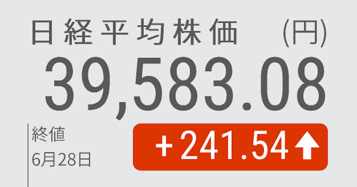 28日の東京株式市場で日経平均株価は反発し、終値は前日比241円54銭(0.61%)高の3万9583円08銭だった。前日の米株式相場の上昇や、外国為替市場で円安が対ドルで一段と進行したのが支えになった。期末とあって国内機関投資家などから持ち高整理の売りも出やすかったが、国内長期金利の上昇圧力を受けた割安株物色も活発になるなかで、買いが優勢だった。